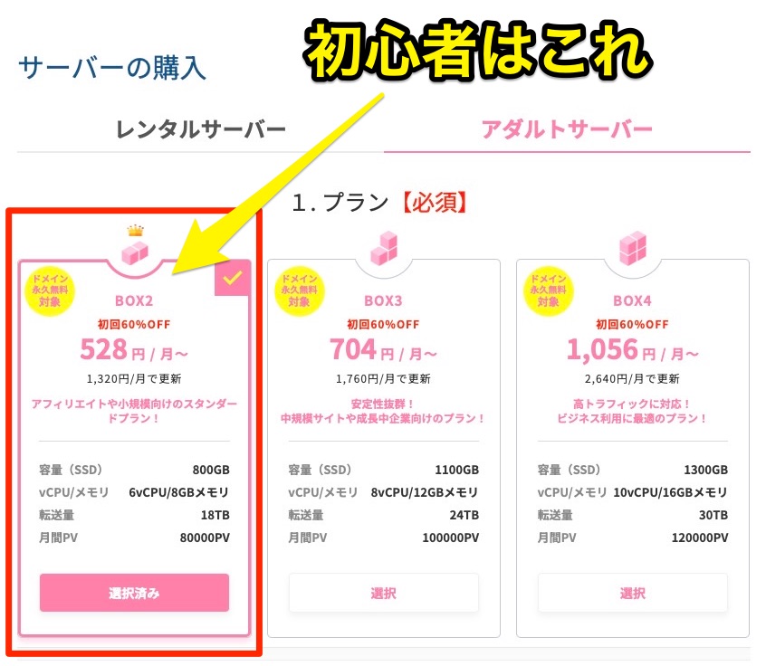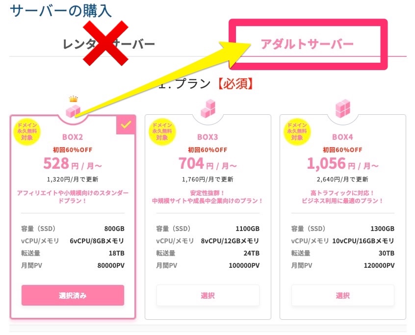 アダルト対応サーバーでは BOX1プランは選べません。最安プランは BOX2 からになります。