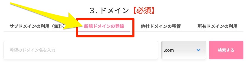 プランを選択した次の画面で、ドメインの設定を行います。「新規登録するドメインを使用する」 を選択してください。