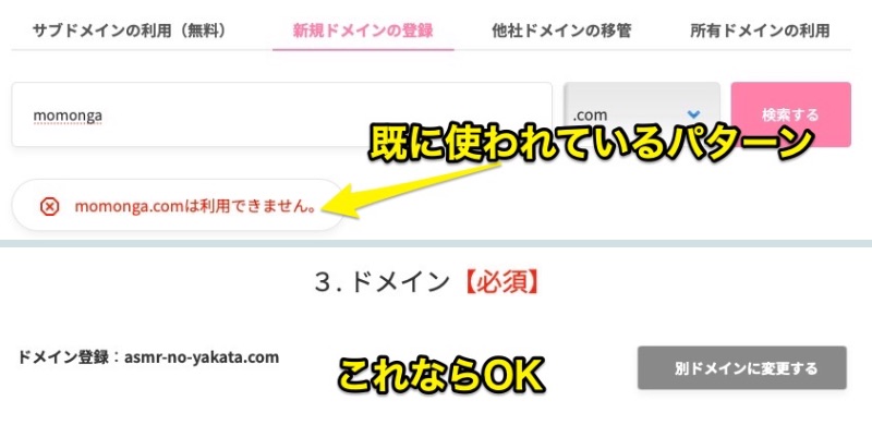 「〜〜〜はご利用できません。」と表示された場合は、すでに他の誰かが使っているドメインです。別のドメイン名を入力して再検索してください。