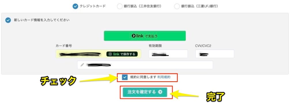 すべて入力したら 「規約に同意します」 にチェックを入れ、「注文を確定する」 をクリック。これで申し込み完了です。