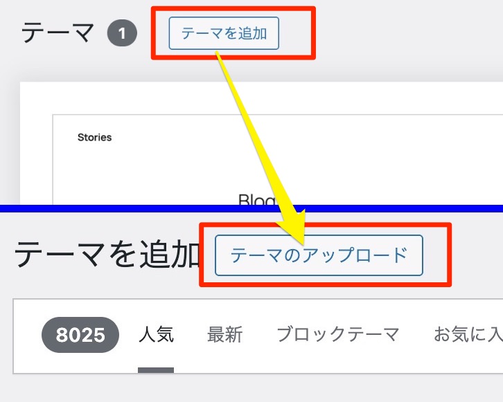 続いて画面上部の 「テーマを追加」→ 「テーマのアップロード」 をクリック。