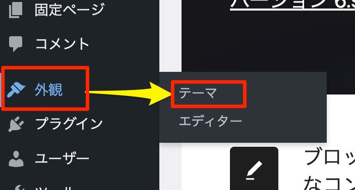- ワードプレス管理画面の 「外観」→「テーマ」 をクリック