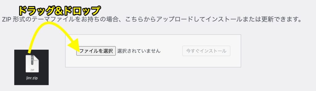 「ファイルを選択」 からダウンロードしたzipファイルを選択するか、テーマのzipファイルをドラッグ&ドロップしましょう。ファイルがアップロードされたら「今すぐインストール」をクリックします。
