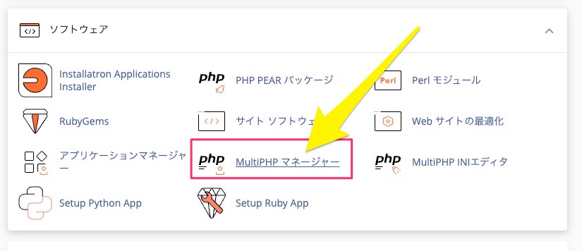 ログインできたら下にスクロールしていきましょう。画像のように【ソフトウェア】という項目があります。その中にある 「MultiPHP マネージャー」 をクリックしてください。
